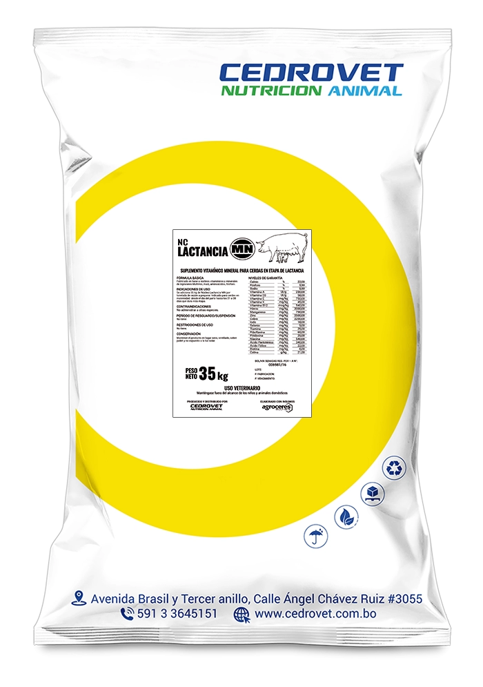 INDICACIONES DE USOSe adiciona 35 kg de Núcleo Lactancia MN por tonelada de ración a preparar. Indicado para cerdas en maternidad desde el día del parto hasta los 21 a 28 días que dura esta etapa.